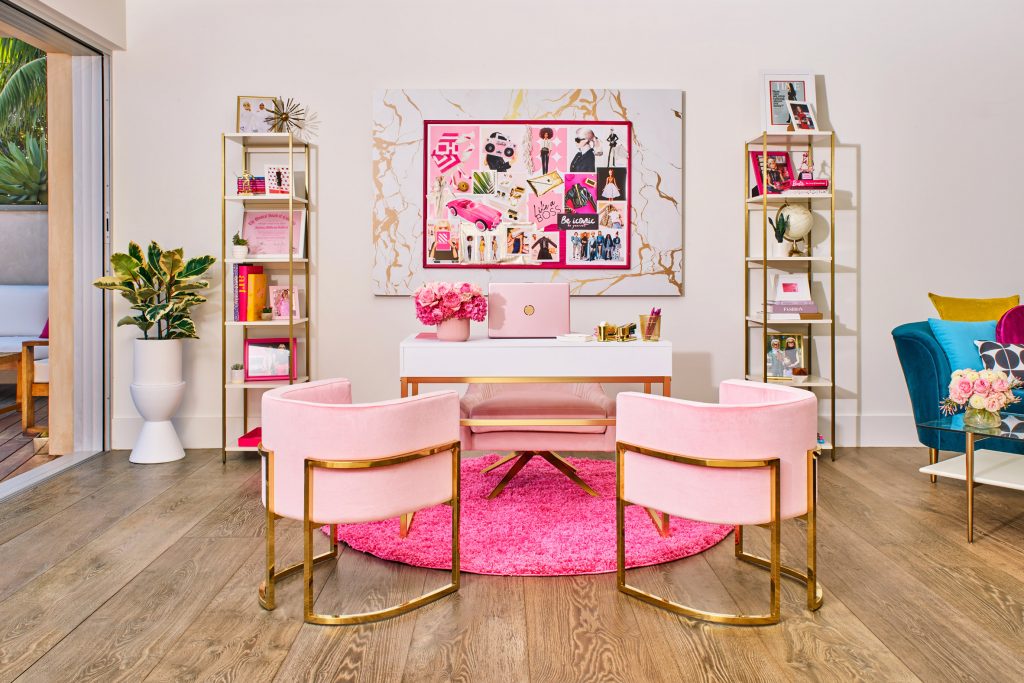 Pink walls, furniture, accessories, kitchenware, and outdoor seating are some of the defining features throughout the Malibu Dreamhouse.